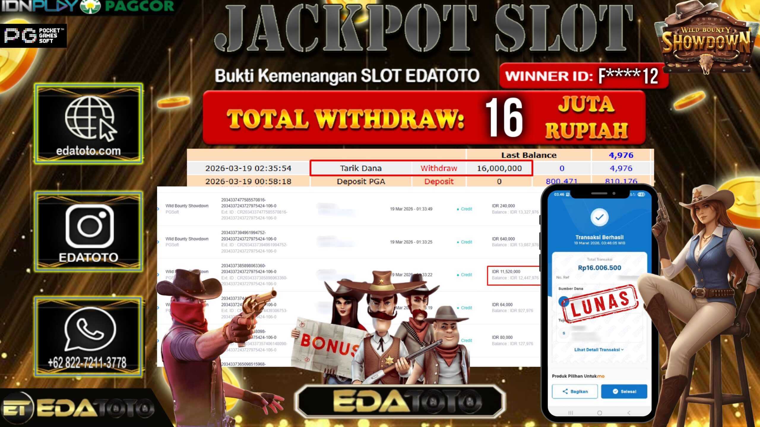 Selamat Kepada Pemilik user ID : F****12 Hari/Tanggal : Kamis / 19 MARET 2026 Jackpot : Rp, 11,520,000 JT Withdraw . . .