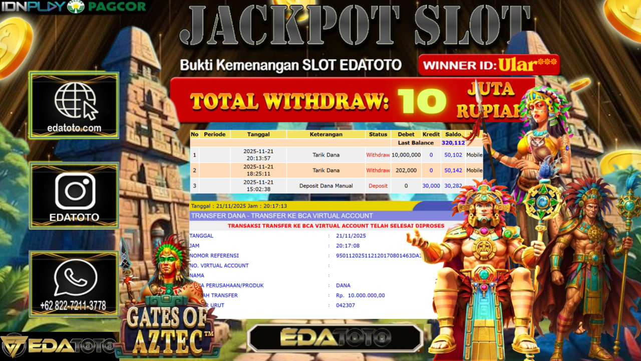 Selamat Kepada Pemilik user ID : ULAR*** Hari/Tanggal :Sabtu / 20, November 2025 Jackpot : Rp. 9,000,000 JT Withdraw :10,000,000 JT . . .
