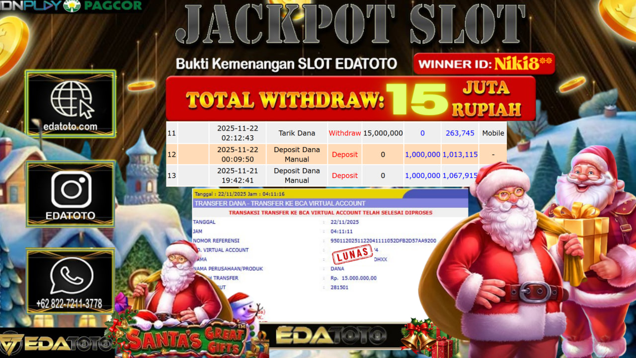 Selamat Kepada Pemilik user ID : NIKI8** Hari/Tanggal :Minggu / 22, November 2025 Jackpot : Rp. 12,957,000 JT Withdraw :15,000,000 . . .