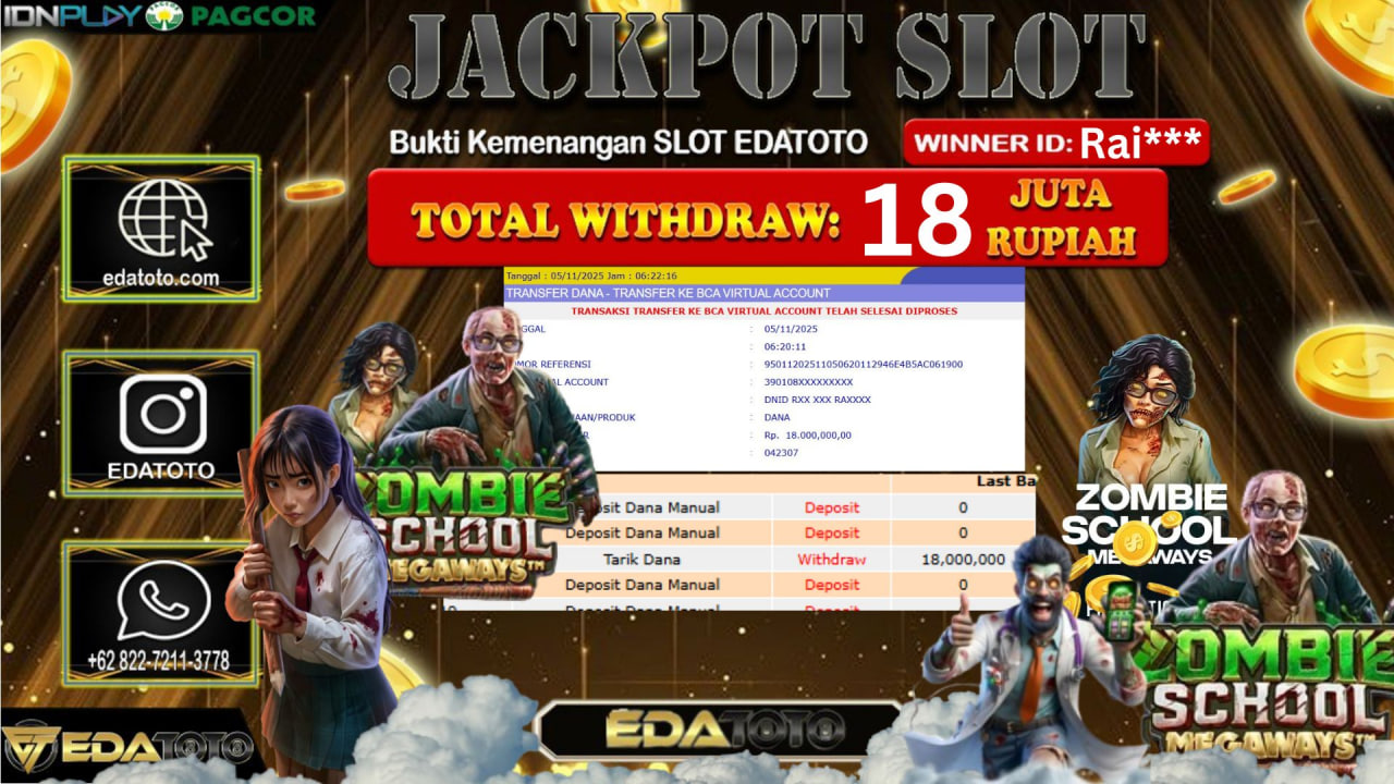 Jackpot : Rp. 18,000,000 JT Withdraw :18,000,000 JT Permainan : Zombie School Megaways Selamat kepada member setia EDATOTO telah mendapatkan JP . . .