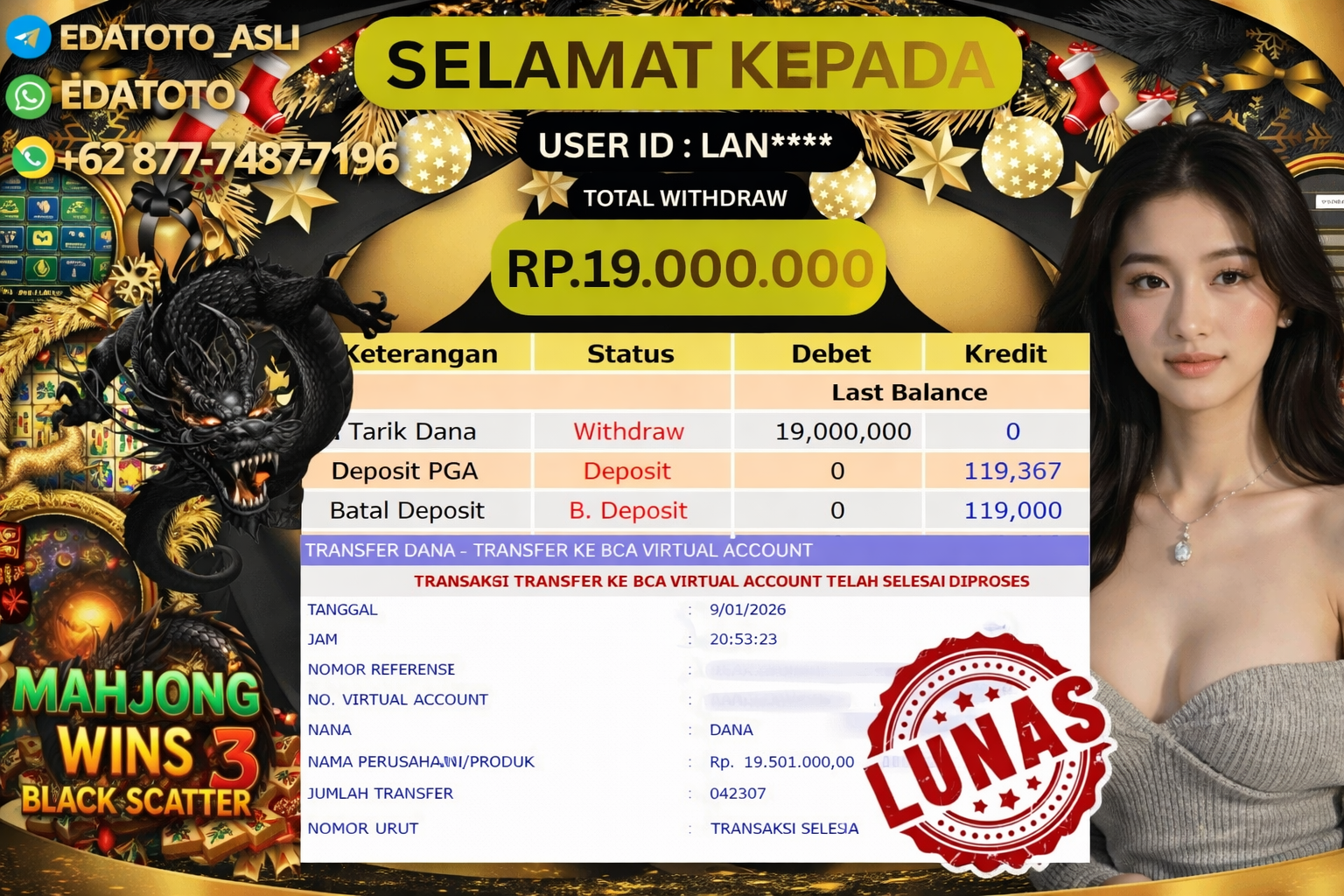 Selamat Kepada Pemilik user ID : LAN**** Hari/Tanggal :kamis/ 9, Januari 2026 Jackpot : Rp. 19,000,000 JT Withdraw : 19,000,000 . . .